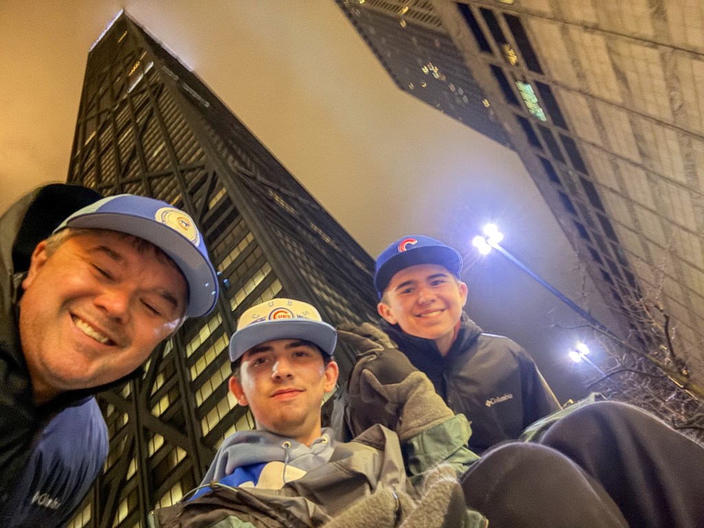 We recuperated with warm food and drinks at Goddess and the Baker’s coffee shop on our walk back, and while sipping coffee and scrolling through my phone, my dad’s words lifted my spirits and we still had a “dinger” of a day. We went up the nation’s fastest elevator in the observatory for some great views, hit Jake Melnick’s for some Chicago-style wings (everything is Chicago-style, just go with it), picked out some drip at the Cubs team store downtown, and wandered the city and took some great pictures and what not.