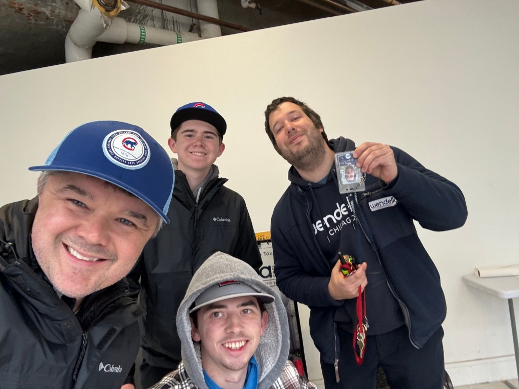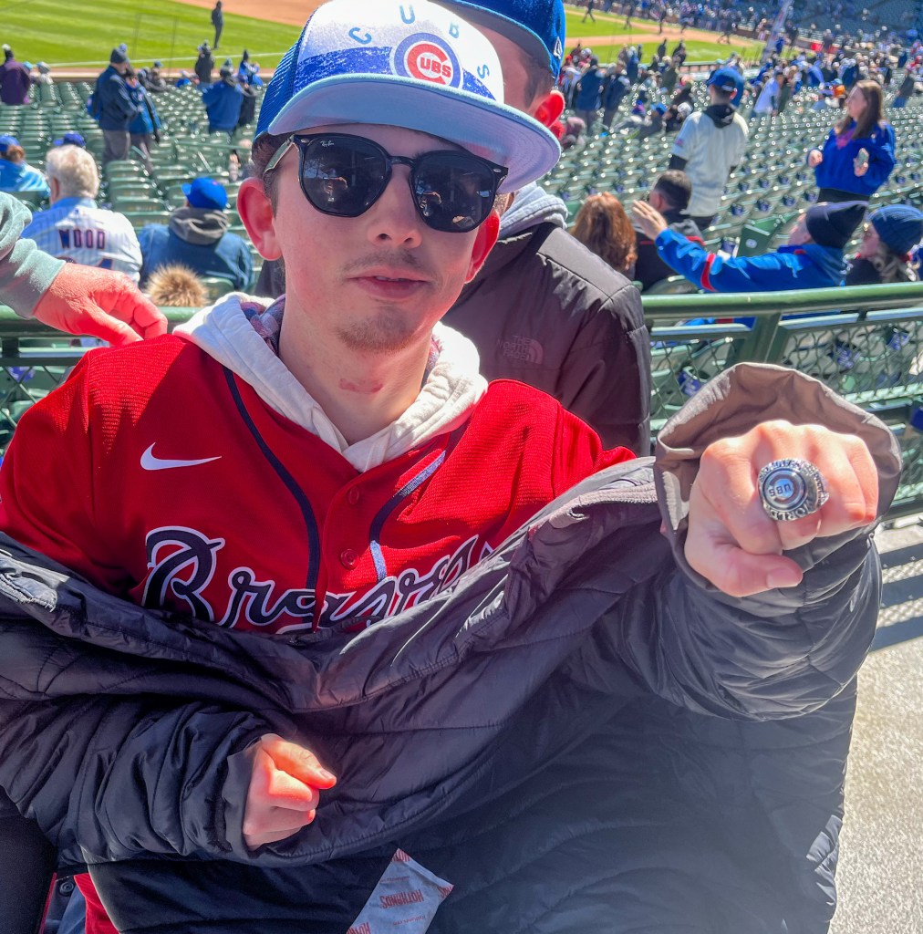 That kind of hospitality leads me to our last day of the trip in Wrigleyville. I was nervous about going there and navigating the park. I’m used to Truist Park in Atlanta, built in 2017, which has all the modern amenities and accommodation. I wasn’t so sure about a park built in 1914, but “The Friendly Confines” lived up to its name. I was put at ease from the start by a stair lift with a smiling employee standing ready to operate it at all times. When we got to out seats, which were marked off with a line rope thing, they yelled “everyone out! Clear the way!” so that people in China could hear. We were on field level behind the plate, but I think our accessible row was up one staircase, and it was a great spot for a selfie. I bet the employees scared a fan or two out of a selfie. They covered all the basic accommodations and even took us on a walk around the park and let me take a picture with the 2016 Cubs World Series ring.